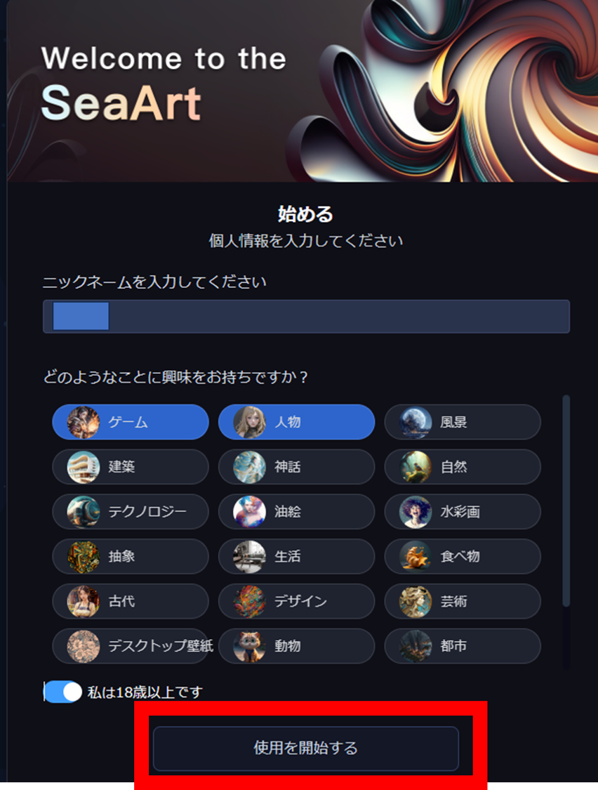 「ニックネーム」を入力した後、興味があるカテゴリを選択し、
