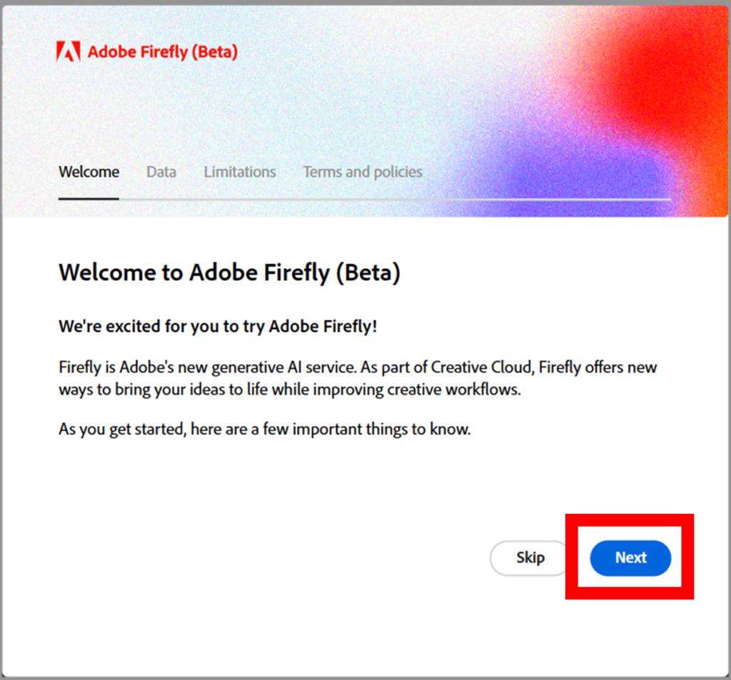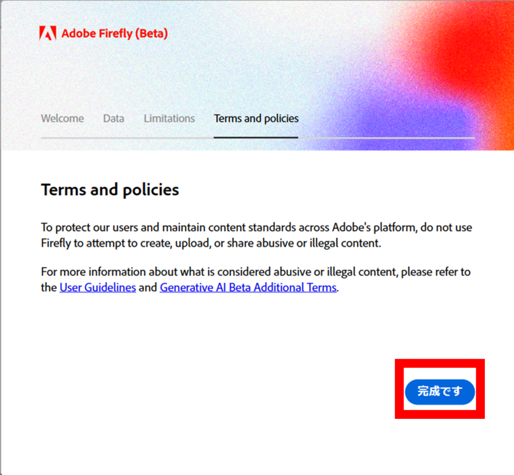 Adobe Fireflyの規約やポリシーが表示された下記画面が表示されます。
