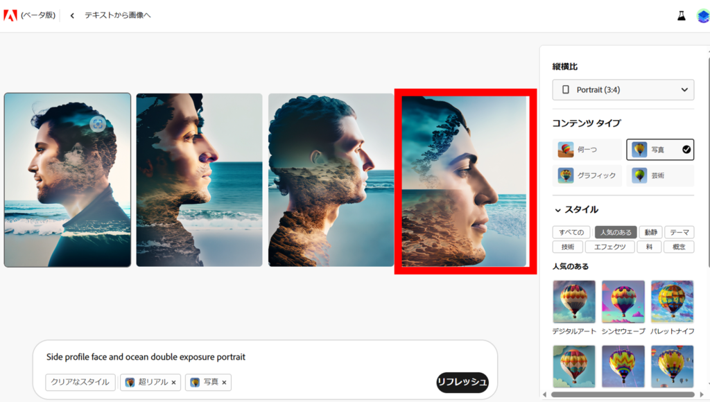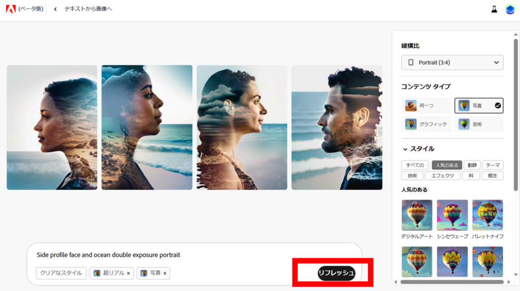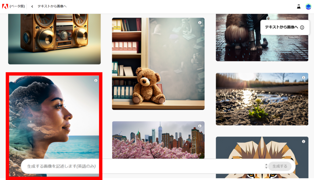 ここから、Adobe Fireflyを使用して画像を生成してみましょう。
