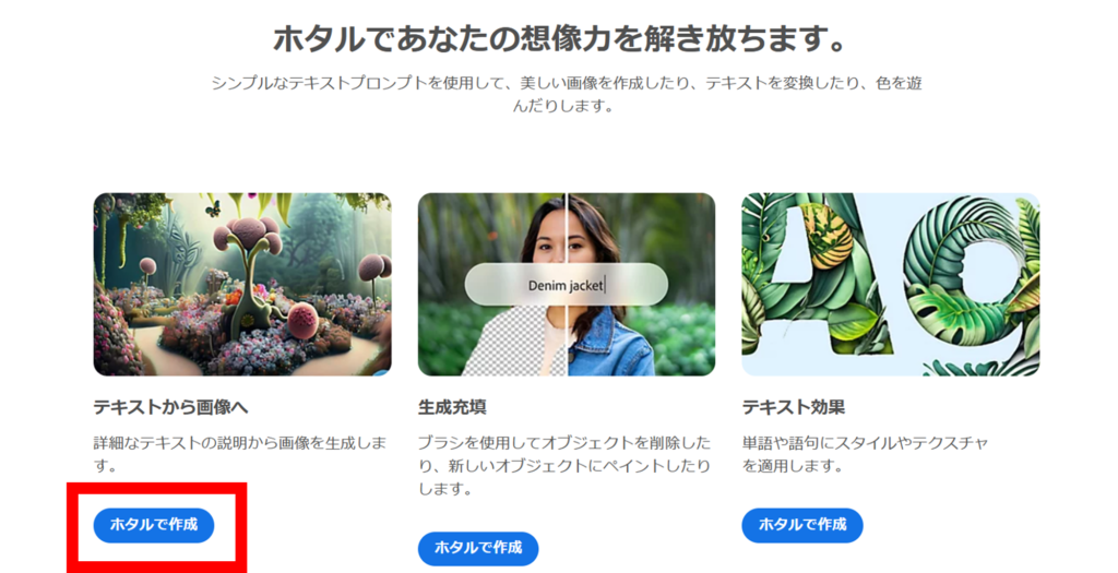 下記リンクから、Adobe Fireflyへ移動します。